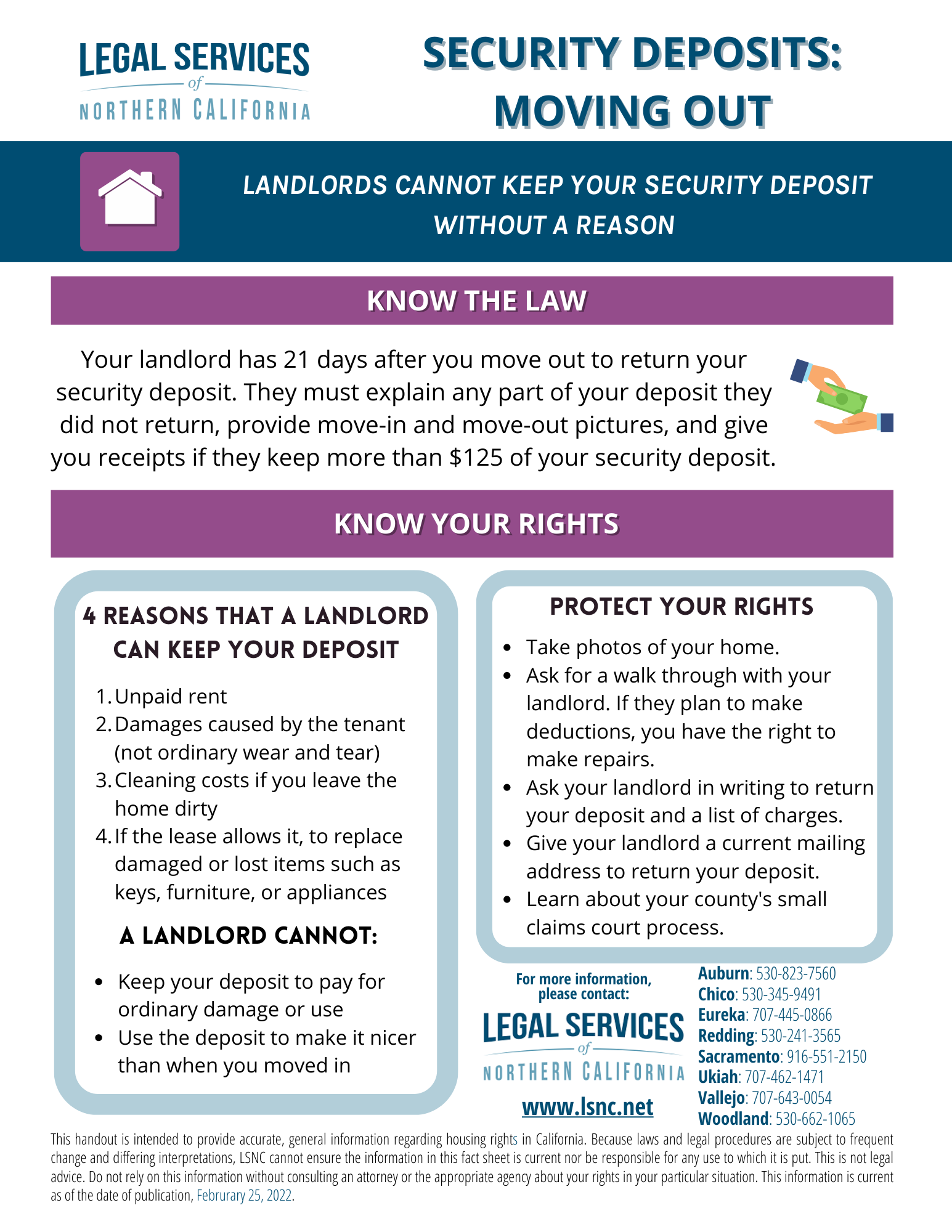 В течение 21 дня после выезда арендатора арендодатель должен отправить по почте или выдать арендатору список вещей, которые арендодатель вычел из гарантийного залога, и вернуть все оставшиеся деньги из залога. Если арендодатель удерживает часть или весь гарантийный залог по четырем причинам, перечисленным выше, он должен выслать арендатору счета или счета-фактуры с объяснением расходов, а также фотографии при въезде и выезде, документирующие ущерб.